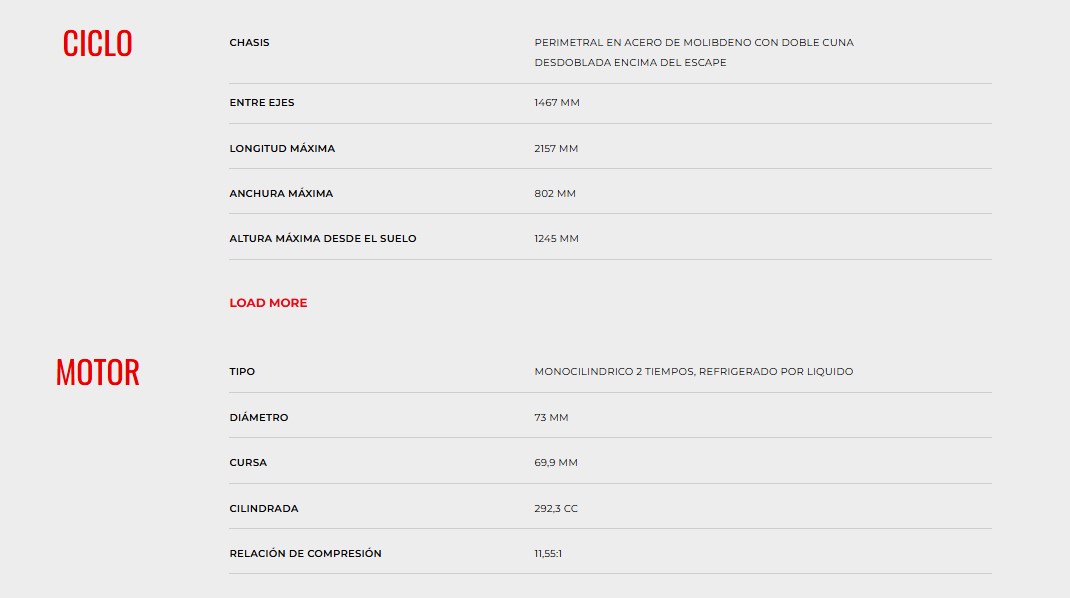 • Motor 250 2T: el motor de 250 cc ha sido objeto de una serie de modificaciones estructurales que lo hacen más similar en su comportamiento a su hermana mayor de 300 cc. Esto ha sido posible gracias al uso de un cigüeñal, con carrera reducida (ahora igual entre 250 y 300 cc), lo que ha supuesto un aumento del diámetro con respecto al modelo anterior. Una nueva culata, con una cámara de combustión diferente, y un nuevo cilindro con barrido adecuado, completan el nuevo propulsor. El resultado de estasintervenciones es un notable aumento del par y de la linealidad de la entrega, sin afectar demasiado al rendimiento máximo, lo que beneficia la facilidad de gestión del vehículo y repercute positivamente en la maniobrabilidad, centralizando las  masas y bajando el centro de gravedad. Además, la bancada del motor aloja nuevos cojinetes más grandes y robustos.
