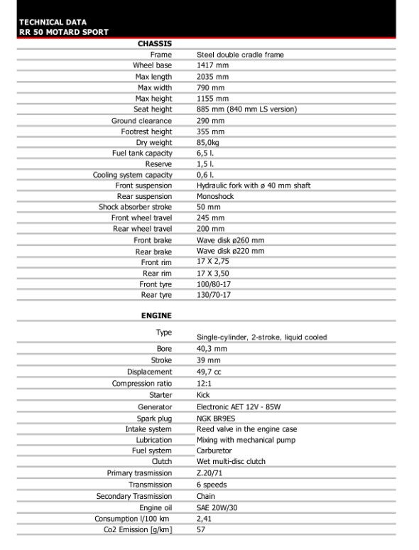 Motor monocilíndrico de 2 tiempos, 6 marchas, refrigerado por líquido, equipado con mezclador de aceite (excepto en la RR 50 Race).